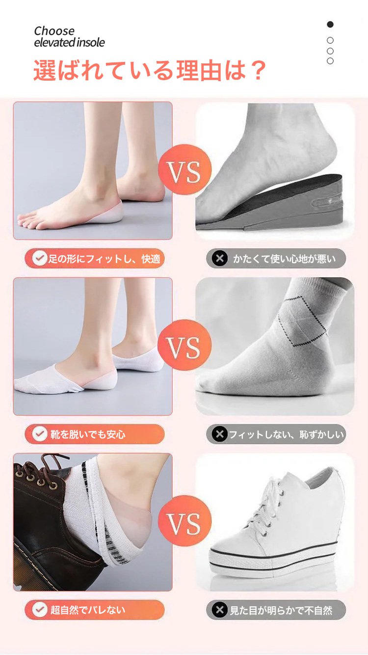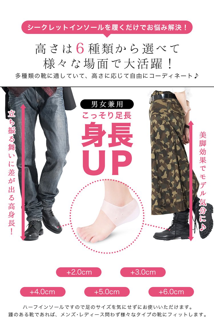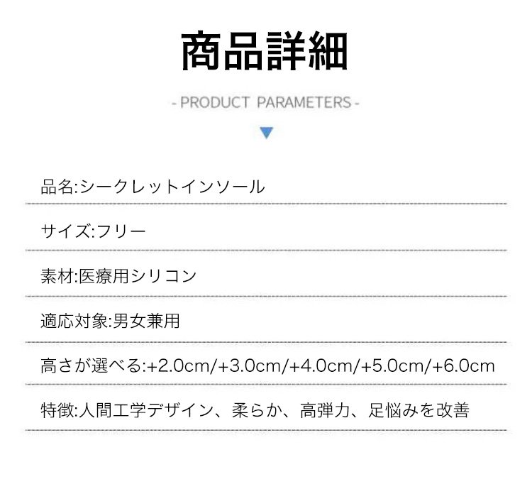 【シークレットインソール】身長up、脚長·衝撃吸収、医療用シリコン、通気性抜群、男女兼用、水洗いOK